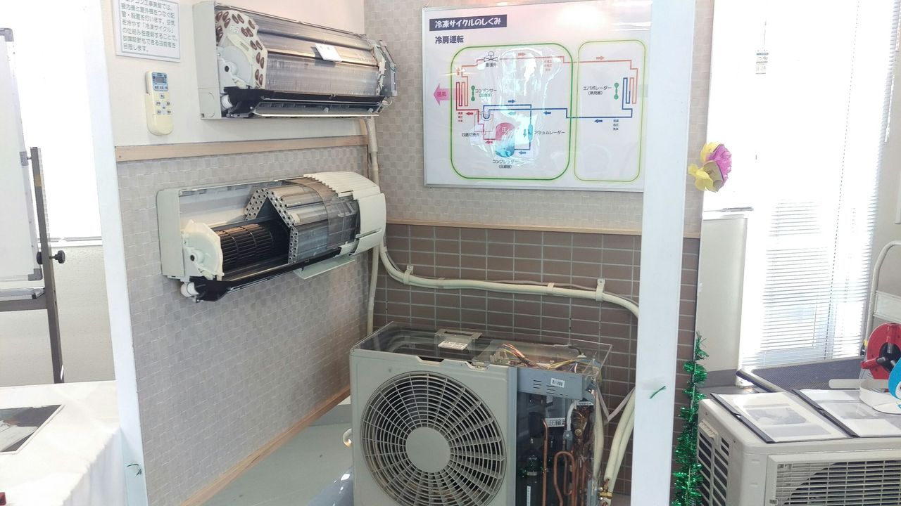 ビルのエアコンも基本は同じですが、ビルだと系統毎に一つの室外機を幾つもの室内機で共用し、設備員の控室などのコントローラーで集中して管理する「ビルマル」というシステムを使っている所もあります。